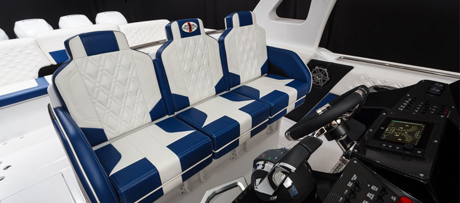 HELM SEAT WITH INDIVIDUAL FOOTRESTS & REAR FACING SEATS WITH BUILT IN INSULATED COOLER